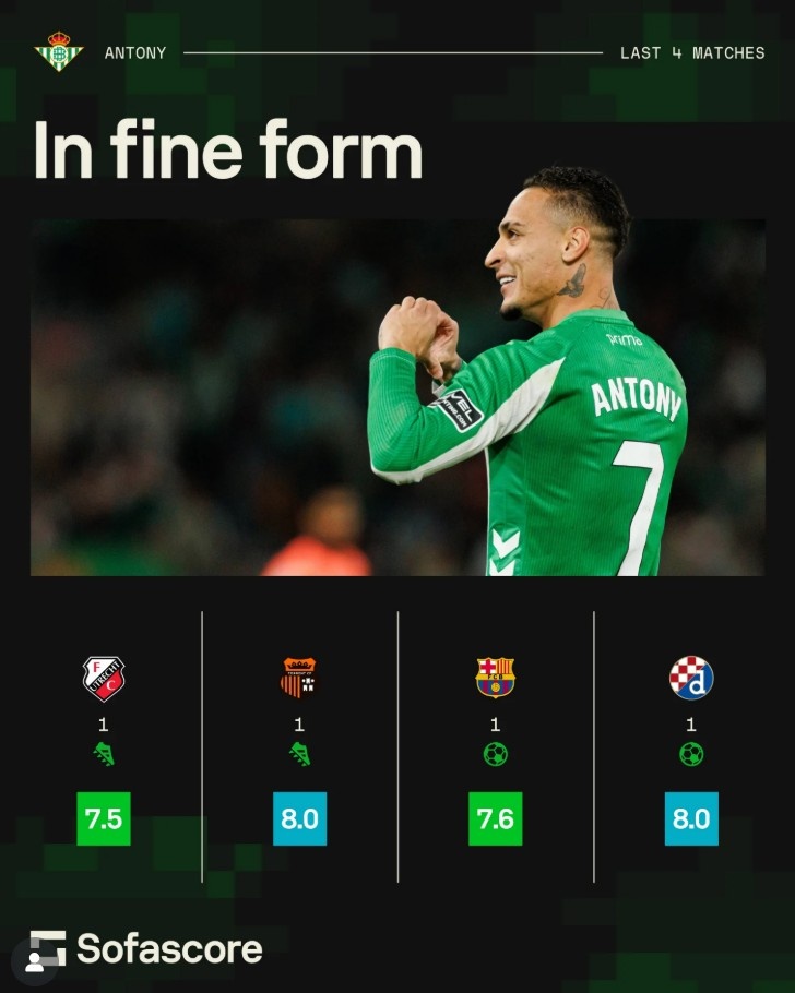 状态正佳!安东尼连续4场参与进球,场均评分均在7.5分及以上