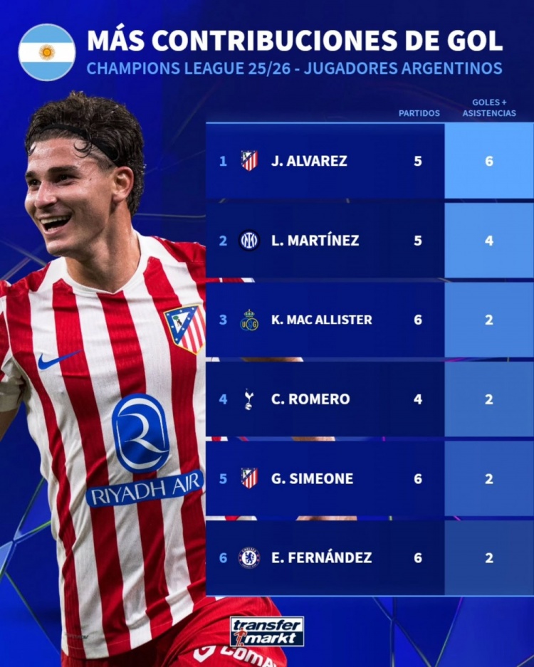 12月12日讯 德国转会市场统计了本赛季阿根廷球员在欧冠的参与进球数量,并列出榜单。