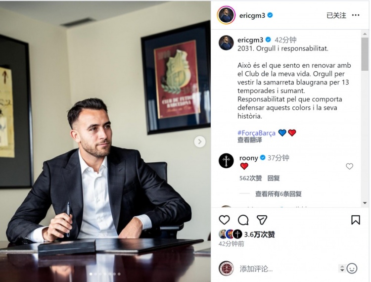 埃里克·加西亚社媒晒出续约照片,并写道:“2031年,自豪与责任。”